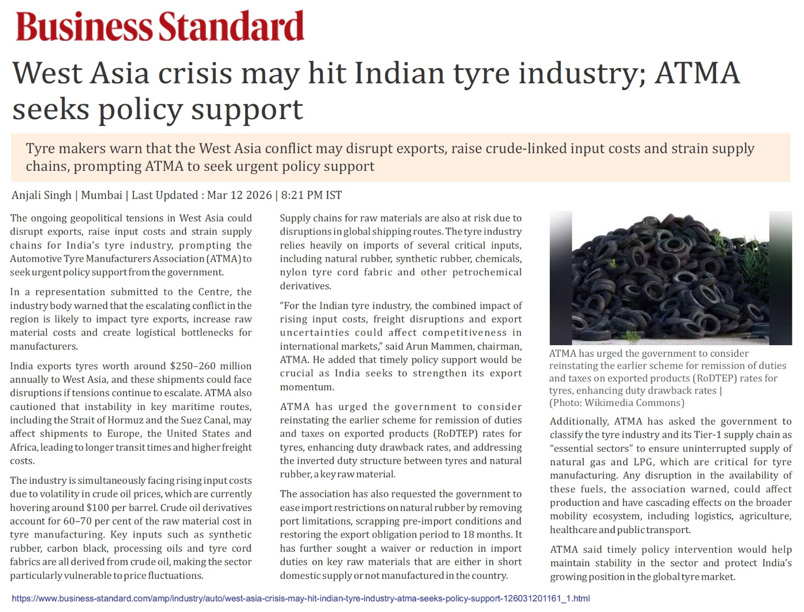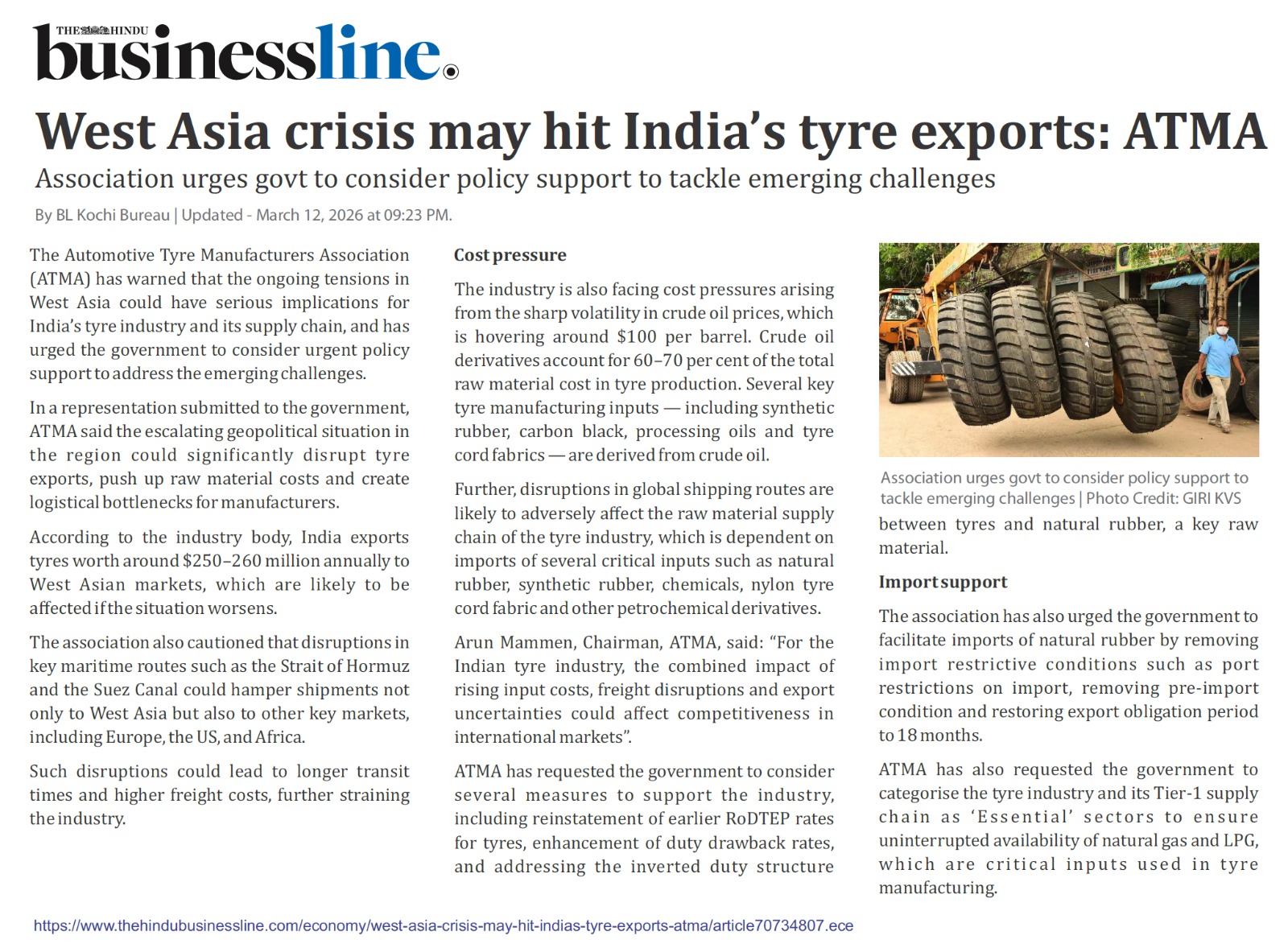 Headquartered in New Delhi (India), Automotive Tyre Manufacturers’ Association (ATMA) is amongst the most active and well known national industry bodies in the country. Being a representative body of large tyre companies in India accounting for over 80% of tyre production, ATMA has been accorded the coveted status of true voice of the Indian tyre industry.