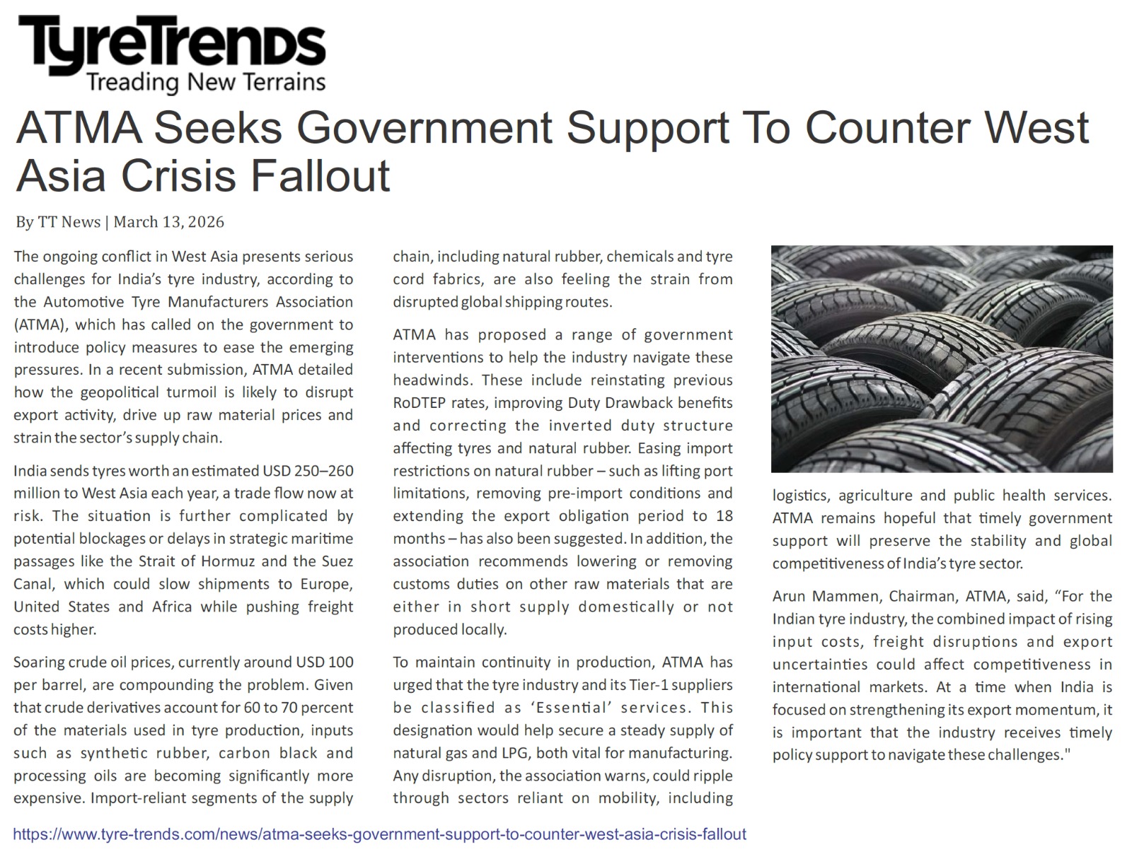 Mr. Arun Mammen, Vice Chairman & Managing Director of MRF Ltd has been elected as the new Chairman of Automotive Tyre Manufacturers’ Association (ATMA), the national industry body for the automotive tyre sector in India. Mr Hiroshi Yoshizane, Managing Director Bridgestone India is the new Vice Chairman of ATMA.