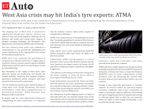 atmaindia2026-03-14 08:46:332026-03-14 09:56:52West Asia crisis may hit India’s tyre exports: ATMA