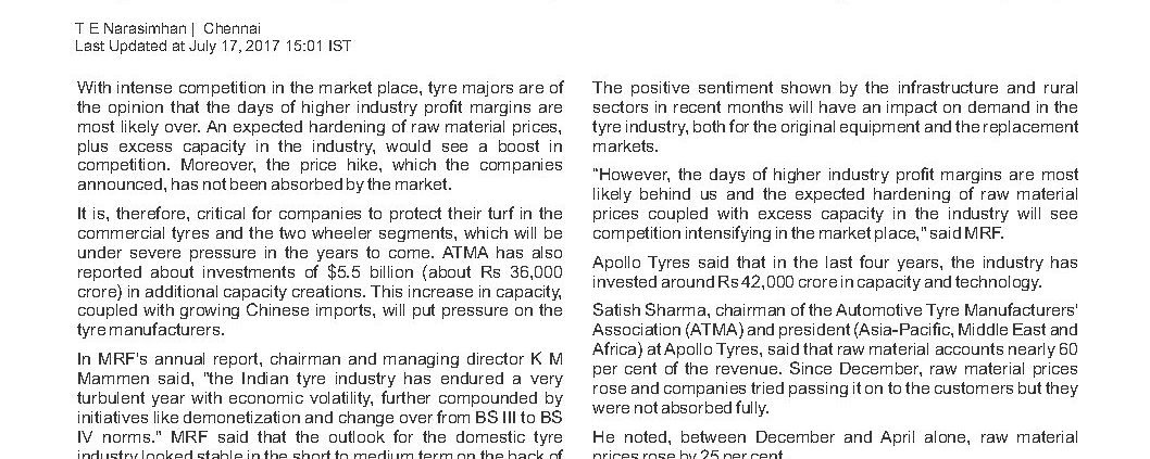 atmaindia2017-07-18 09:47:382018-07-24 10:09:34Tyre companies expect margin pressure ahead