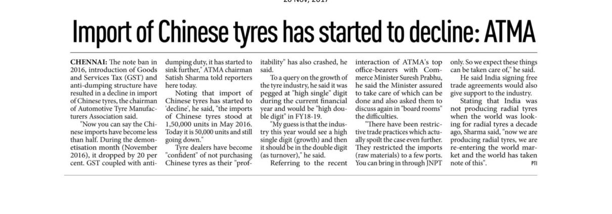 atmaindia2017-11-26 09:47:272018-07-24 09:53:49Import of Chinese tyres has started to decline: ATMA