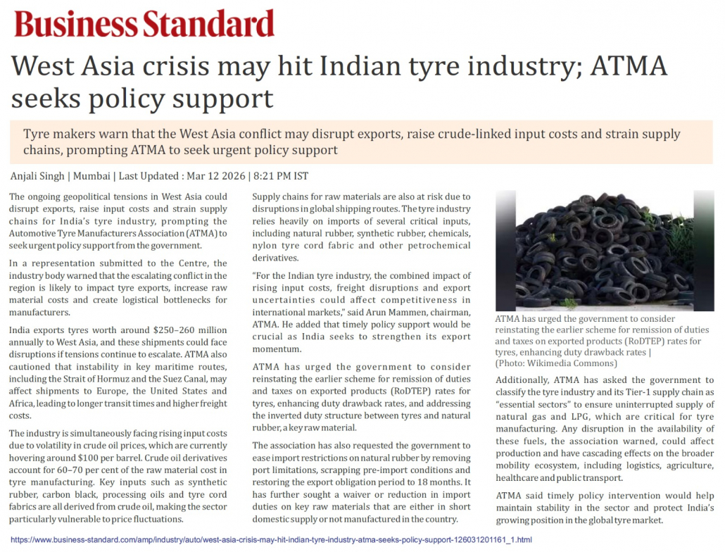 West Asia crisis may hit Indian tyre industry: ATMA seeks policy support